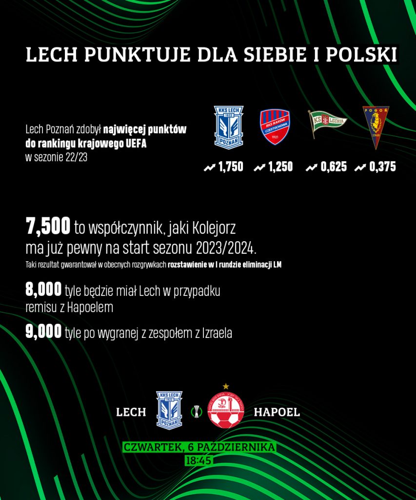 Lech Poznań to ostatni nasz reprezentant w europejskich pucharach. Mistrz kraju promuje na swojej stronie tekst pod tytułem „Lech punktuje dla siebie i Polski”. Możemy się z niego dowiedzieć się, dlaczego warto kibicować Kolejorzowi. Już teraz wiadomo, że jeśli lechici awansują do europejskich pucharów 2023/2024, to wystartują w nich ze współczynnikiem przynajmniej 7,500. To spora zmiana względem 6,000 z tego sezonu. Taki wynik teraz zapewniłby rozstawienie już w I rundzie i uniknięcie Karabachu na starcie.