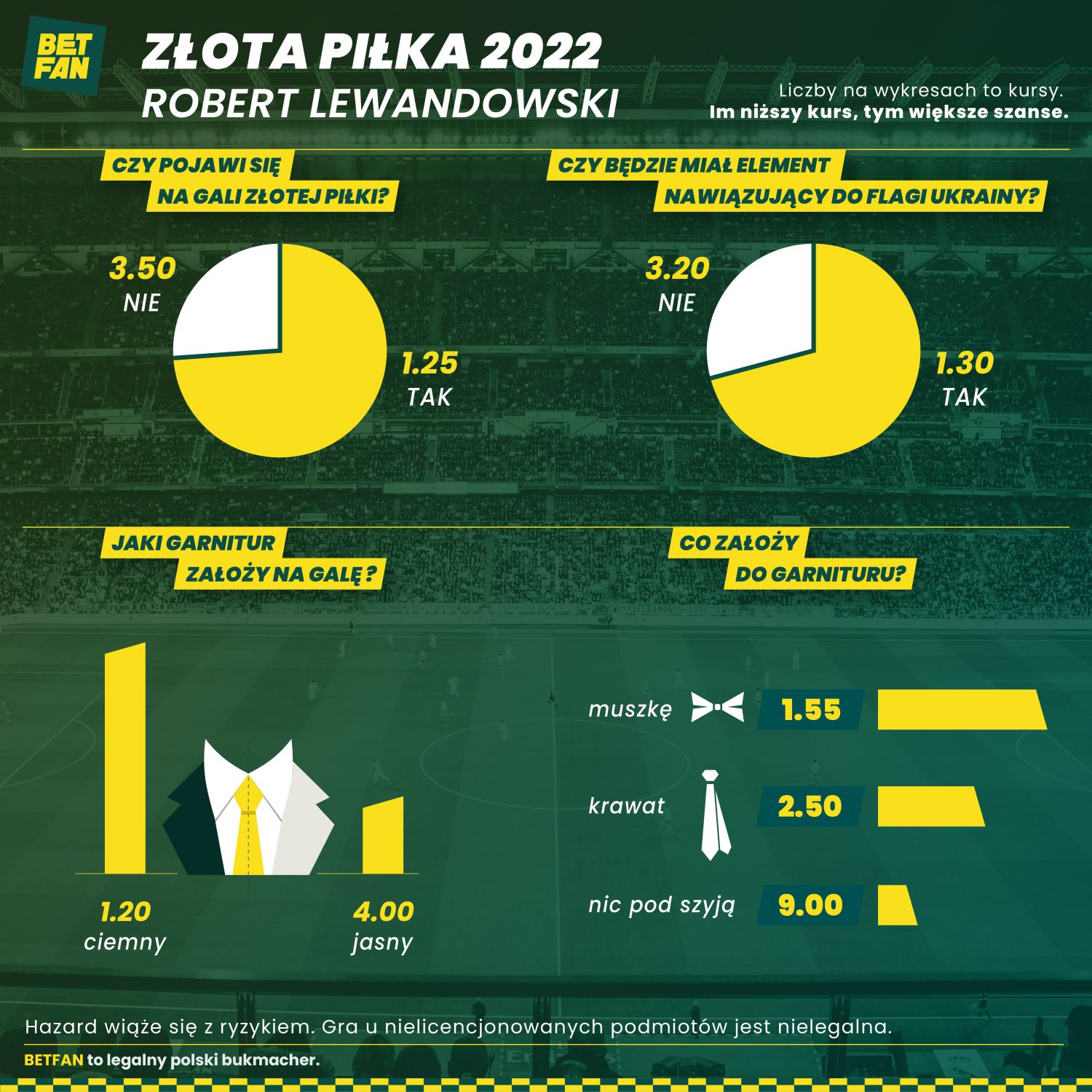 Co do wyglądu Roberta, zdaniem BETFAN, piłkarz będzie miał na stroju element nawiązujący do flagi Ukrainy. Lewandowski już wcześniej wykorzystywał swoją popularność, by zwrócić uwagę opinii publicznej wciąż trwającą w tym kraju wojnę. Polski zawodnik otrzymał też opaskę kapitańską reprezentacji tego kraju. Wedle BETFAN, będzie to jedyny niestandardowy akcent w stroju Roberta. Poza tym jego strój w ciemnej tonacji nie zaskoczy ekstrawagancją i będzie głównie tłem dla kreacji i urody swojej żony.