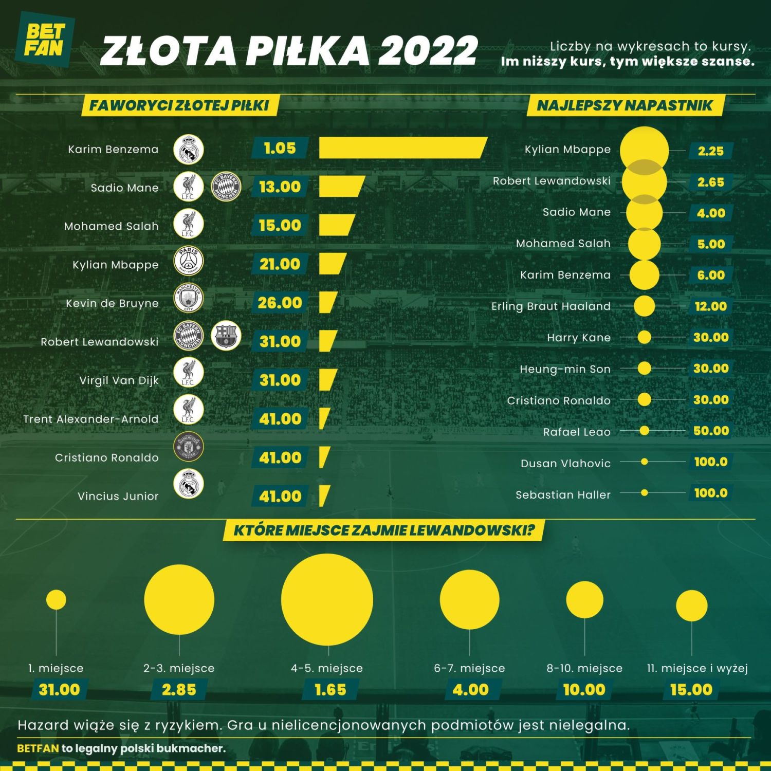 Jednocześnie analitycy polskiego bukmachera nie mają wątpliwości, że Złota Piłka, najbardziej upragnione przez piłkarzy wyróżnienie, i w tym roku niestety nie trafi do Roberta. Według przewidywań nagrodę otrzyma Karim Benzema, zawodnik Realu Madryt. Jest on tak mocnym faworytem, że drugi w kolejce do trofeum, grający w barwach Bayernu Sadio Mane, ma kilkukrotnie niższe szanse. Zdaniem BETFAN Robert Lewandowski ostatecznie uplasuje się na czwartym lub piątym na miejscu wśród pretendentów do tej nagrody.