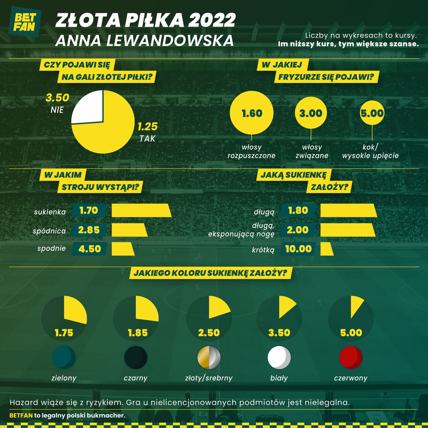 Wygląd teamu Lewandowskich jest dla ich fanów zawsze interesujący, więc bukmacher pokusił się o przewidywania dotyczące ich strojów. Zdaniem BETFAN Anna Lewandowska najprawdopodobniej założy suknię, w której dominującym kolorem będzie zielony. Niezłe (choć mniejsze) szanse są też na to, że wybór Anny padnie na kolor czarny. Zdaniem BETFAN nie należy oczekiwać u niej tego wieczoru spodni. Bukmacher uważa też, że suknia żony piłkarza będzie długa. Są też spore szanse na to, że jej kreacja miała rozcięcie, które pozwoli wyeksponować nogę. Co do fryzury – wedle BETFAN Anna Lewandowska najpewniej pokaże się w rozpuszczonych włosach.