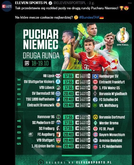 Po raz kolejny Eleven Sports imponuje z liczbą pokazanych spotkań w przypadku Pucharu Niemiec. Dzisiaj oraz jutro stacja przeprowadzi transmisje z 75% spotkań drugiej rundy DFB Pokal!