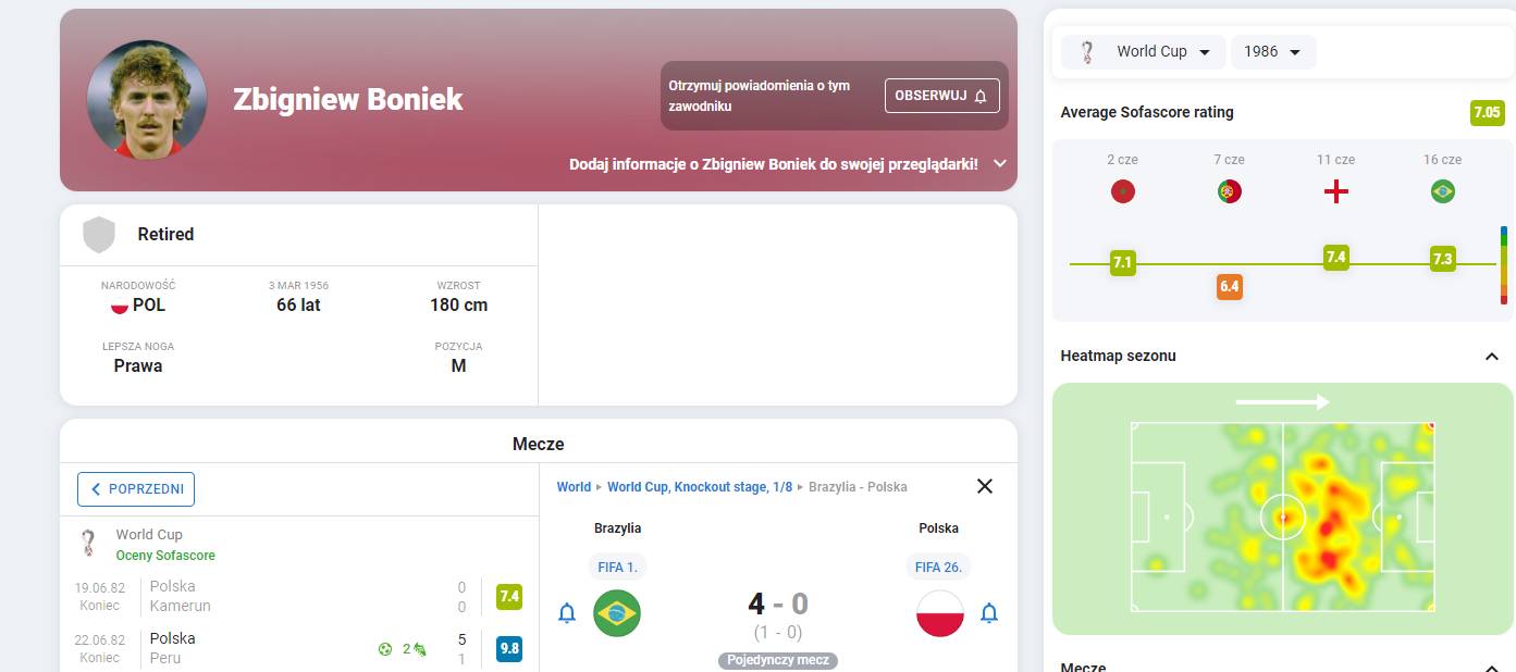 Tym samym możemy sprawdzić, jak radził sobie m.in. Zbigniew Boniek w trakcie mundialu w 1982 roku, kiedy to zanotował genialny występ przeciwko Peru, otrzymując od SofaScore ocenę 9.8. Nie brakuje również statystyk legendarnego Pele z mistrzostw świata z 1966 roku oraz mundialu 1970.