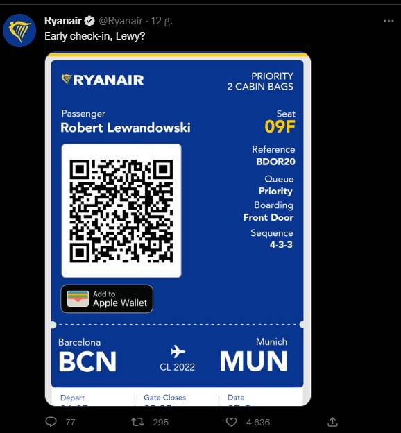 Obawy się potwierdziły, gdyż Robert Lewandowski nie zagra w fazie pucharowej Ligi Mistrzów w sezonie 2022/2023. W związku z zaistniałą sytuacją, Ryanair zażartował z Polaka, przygotowując mu bilet… powrotny do Monachium.