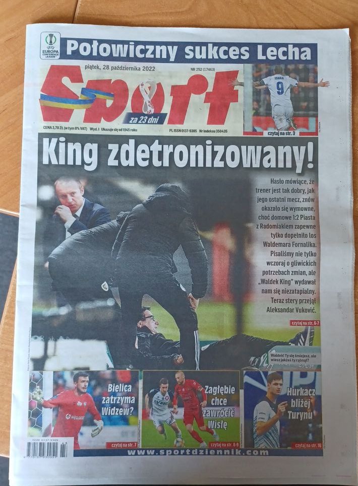 Katowicki Sport przygotował dzisiaj specjalną okładkę poświęconą odejściu Waldemara Fornalika. Chociaż trudno powiedzieć, by była „poświęcona”, bowiem tutaj zabrakło dobrego smaku. Zdjęcie leżącego trenera po upadku, z podpisem „King zdetronizowany” to jedno. Najgorzej wygląda tekst zapisany w prawym dolnym rogu. – Waldek! Ty się śmiejesz, ale wiesz jakżeś ty rąbnął! – brzmi jakby jeden ze współpracowników miał wypowiedzieć te słowa do dotychczasowego trenera Piasta.