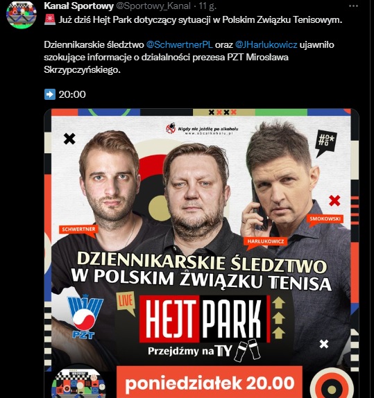 Wczorajszy Hejt Park miał mieć bardzo poważny temat przewodni. Prowadzący Tomasz Smokowski zaprosił do niego dziennikarzy Onetu – Janusza Schwertnera oraz Jacka Harłukowicza. To właśnie ten duet dziennikarzy opisał w miniony piątek działania prezesa Polskiego Związku Tenisa. W dużym śledczym tekście pod adresem Mirosława Skrzypczyńskiego pojawiły się bardzo poważne zarzuty. Wśród nich m.in. fizyczne i psychiczne znęcanie się nad żoną, teściową czy córkami. W tle także molestowanie seksualne swoich byłych podopiecznych, gdy Skrzypczyński był trenerem.