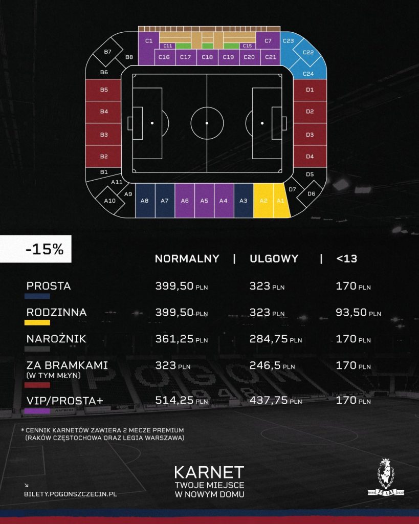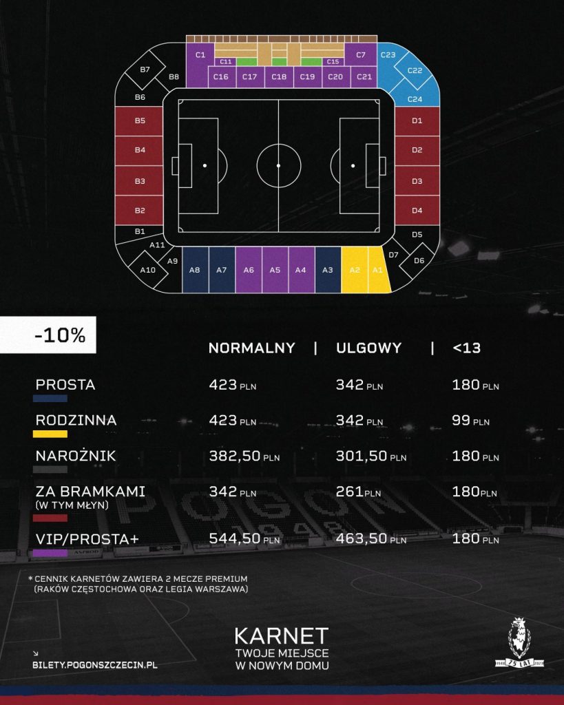 Najdroższe wejściówki, czyli VIP/PROSTA+ to wydatek rzędu 514,25 złotych przy zakupie w grudniu. Warto dodać, że w pierwszym miesiącu sprzedaży każdy kibic zaoszczędzi 15% względem nominalnych cen biletów na pojedyncze spotkania. W dalszej kolejności są ceny na trybuny „Prosta” oraz „Rodzinna” – 399,50, „Narożnik” – 361,25zł oraz „za bramkami(w tym młyn)” – 323 zł. To oznacza, że rozpiętość cenowa przeliczając na jedno spotkanie, wyniesie od 36 do 57 złotych w przypadku biletów normalnych.