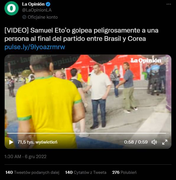 W poniedziałkowy wieczór Brazylia rywalizowała z Koreą Południową. Mecz zakończył się bez niespodzianki, gdyż "Canarinhos" wygrali 4:1 i zameldowali się w ćwierćfinale, gdzie zagrają z Chorwacją. Na trybunach podczas tego spotkania był Samuel Eto'o. Po końcowym gwizdku sędziego doszło do skandalicznej sytuacji z udziałem szefa kameruńskiej piłki. Eto'o zaatakował jednego z kibiców.