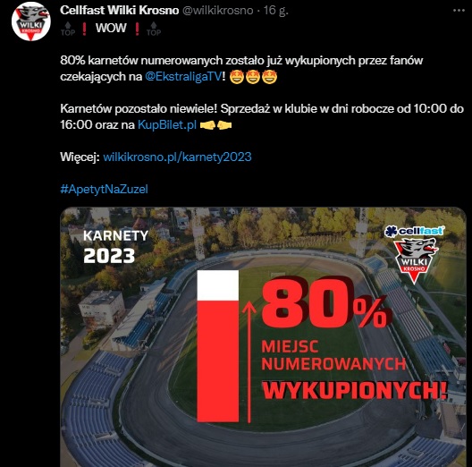– Przy tak kameralnym stadionie posiadanie karnetu, który gwarantuje stałe miejsce siedzące na sezon to niewątpliwie przywilej. Zachęcamy zatem by nie zwlekać z zakupami, bo później będzie można się rozczarować. Karnet da też prawo pierwszeństwa w zakupie biletu na fazę play-off oraz na kolejny sezon rozgrywkowy. Koniecznie trzeba go zatem mieć. Tym bardziej, że nie wiadomo czy w sprzedaży będą w ogóle bilety – powiedział prezes klubu Grzegorz Leśniak dla serwisu WP Sportowefakty. Wilki Krosno chcą także docenić mieszkańców Krosna. Osoby kupujące karnet i posiadające kartę miejską, dostają kalendarz na przyszły sezon za darmo.