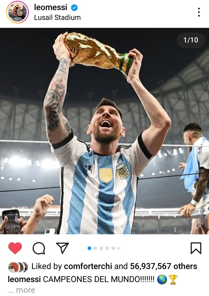 Argentyńczyk (stan na 20 grudnia godzinę 11:26) uzyskał 56,7 mln polubień pod postem z serią zdjęć z trofeum za wygranie mistrzostw świata w Katarze. Można przypuszczać, że w najbliższych dniach ten wynik stale będzie się poprawiać, gdyż Messi wrzucił post 18 grudnia.