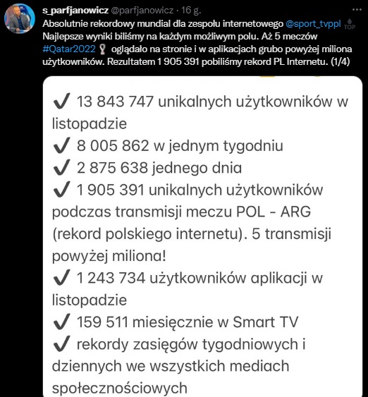 Sebastian Parfjanowicz z TVP Sport przedstawił wiele ciekawych liczb dotyczących stacji z ostatnich tygodni. Kilka już przedstawialiśmy na łamach SportMarketing. Jak chociażby rekord polskiego internetu przy okazji transmisji pojedynczego spotkania. Ponad 1,9 miliona unikalnych użytkowników zanotowała transmisja meczu Polska – Argentyna w aplikacji mobilnej oraz stronie internetowej. Warto dodać, że łącznie aż pięć transmisji przekroczyło granicę miliona podczas mundialu.