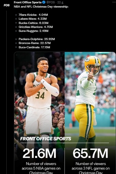 Amerykański profil Front Office Sports podał wyniki oglądalności meczów z „Christmas Day” w Stanach Zjednoczonych. Fakty są takie, że pięć najpopularniejszych meczów NBA łącznie nie wykręciło takiego wyniku, jak najlepszy mecz NFL! Wg tych liczb najchętniej oglądanym spotkaniem NBA było starcie Milwaukee Bucks z Boston Celtics i zgromadziło przed odbiornikami nieco ponad 6 milionów ludzi. Dla porównania numerem jeden w futbolu amerykańskim było spotkanie Green Bay Packers-Miami Dolphins z oglądalnością na poziomie niemal 26 milionów ludzi!