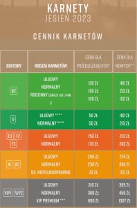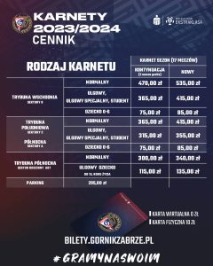 Drugim zespołem będzie drużyna z Zabrza, czyli miejscowy Górnik. W przypadku tej ekipy mamy do czynienia z karnetami ulgowymi, wahającymi się od 115 do 415 złotych w zależności od sektora. Za normalny musimy zapłacić od 300 do 535 złotych, oraz za dziecięcy (do lat 6) od 75 do 85 złotych.