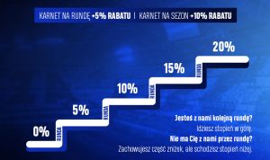 Następnym klubem jest Lech Poznań, w przypadku którego za karnety normalne musimy zapłacić od 630 do 880 złotych, za ulgowe od 500 do 700 złotych. Mamy możliwość kupienia także tych dziecięcych w cenie od 315 do 440 złotych. Dodatkową akcją związaną z Lechem Poznań jest promocja dotycząca osób przedłużających abonament klubu z ulicy Bułgarskiej. Z każdą kolejną rundą osoba przedłużająca subskrypcję otrzymuje dodatkowe 5 procent zniżki na kolejny, co ilustruje poniższa grafika.