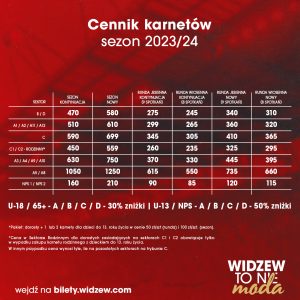 Przyszedł czas na drugą drużynę z Łodzi, czyli ŁKS. Beniaminek nadchodzącego sezonu 2023/2024 przedstawia ceny swoich abonamentów następująco: normalne od 420 do 750 zł, ulgowe od 285 do 600 zł, a dziecięce od 120 do 350 złotych. Klub posiada również możliwość zakupu sezonowych biletów VIP, ukazany również w rozpisce na stronie.