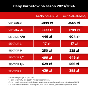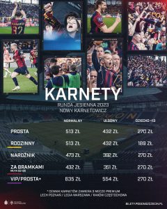 Zagłębie Lubin jest kolejną ekipą, która ruszyła ze sprzedażą swoich karnetów, ale wyłącznie na jesień 2023. W ich przypadku trzeba zapłacić od 150 do 456 złotych za normalne i od 120 do 395 złotych za ulgowe. Dostępne są także karnety dla rodzin, osób niepełnosprawnych oraz karnety VIP Premium.