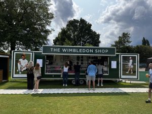 W oficjalnym sklepie można znaleźć praktycznie wszystko z logotypem Wimbledonu. Począwszy od długopisów i breloczków, przez pełną gamę odzieży, sprzętu tenisowego marki Babolat i Slazenger (oficjalni partnerzy turnieju), książki, parasole, porcelanę aż po ręczniki. Ceny do najniższych nie należą i przedstawiają się tak: