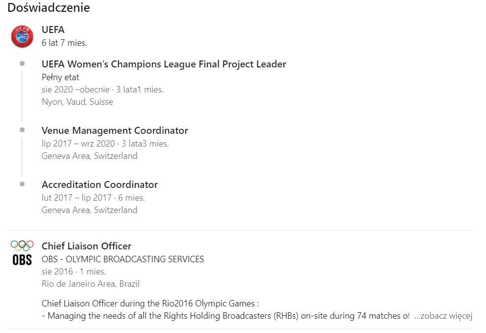 – Moją pierwszą rolą była praca w zespole zajmującym się usługami dla mediów, szczególnie akredytacjami. Do mojego zakresu obowiązków należało prowadzenie bazy danych dziennikarzy, poprzez udzielanie akredytacji, pomoc przy obsłudze mediów, głównie na Euro 2016 we Francji. Podczas tego turnieju nasze biuro centralne znajdowało się w Paryżu, skąd zdalnie z zespołem pomagaliśmy przy obsłudze 51 meczów. Do mnie przypisane były stadiony w Marsylii i Nicei, gdzie przed rozpoczęciem turnieju, pomagałam przygotować zespół pracujący na stadionie, zajmujący się mediami, a podczas wybranych spotkań pomagałam w przebiegu operacji medialnych – np. konferencji prasowych, czy wywiadów pomeczowych.