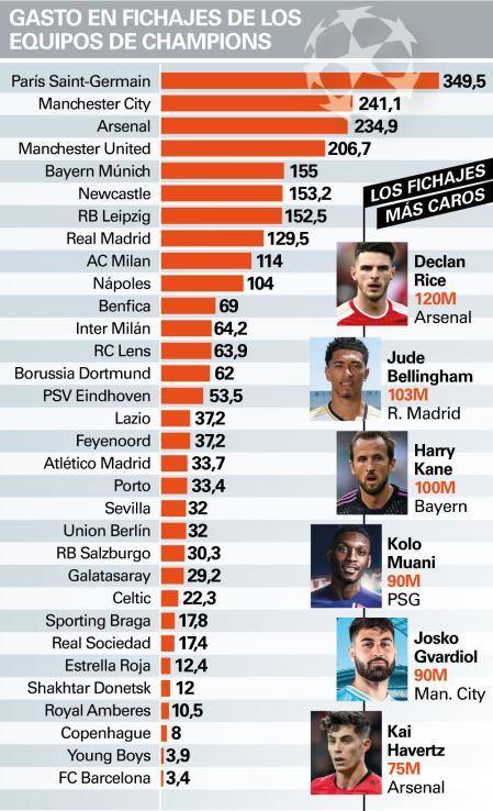 Mistrzowie Francji mają wielki apetyt na triumf w Lidze Mistrzów. W związku z tym, latem przeznaczyli prawie 350 milionów euro na transfery. Drugi w tym zestawieniu jest Manchester City. Obrońca tytułu wydał na nowych piłkarzy 241,1 mln euro, czyli aż o 108,4 mln euro mniej niż PSG.