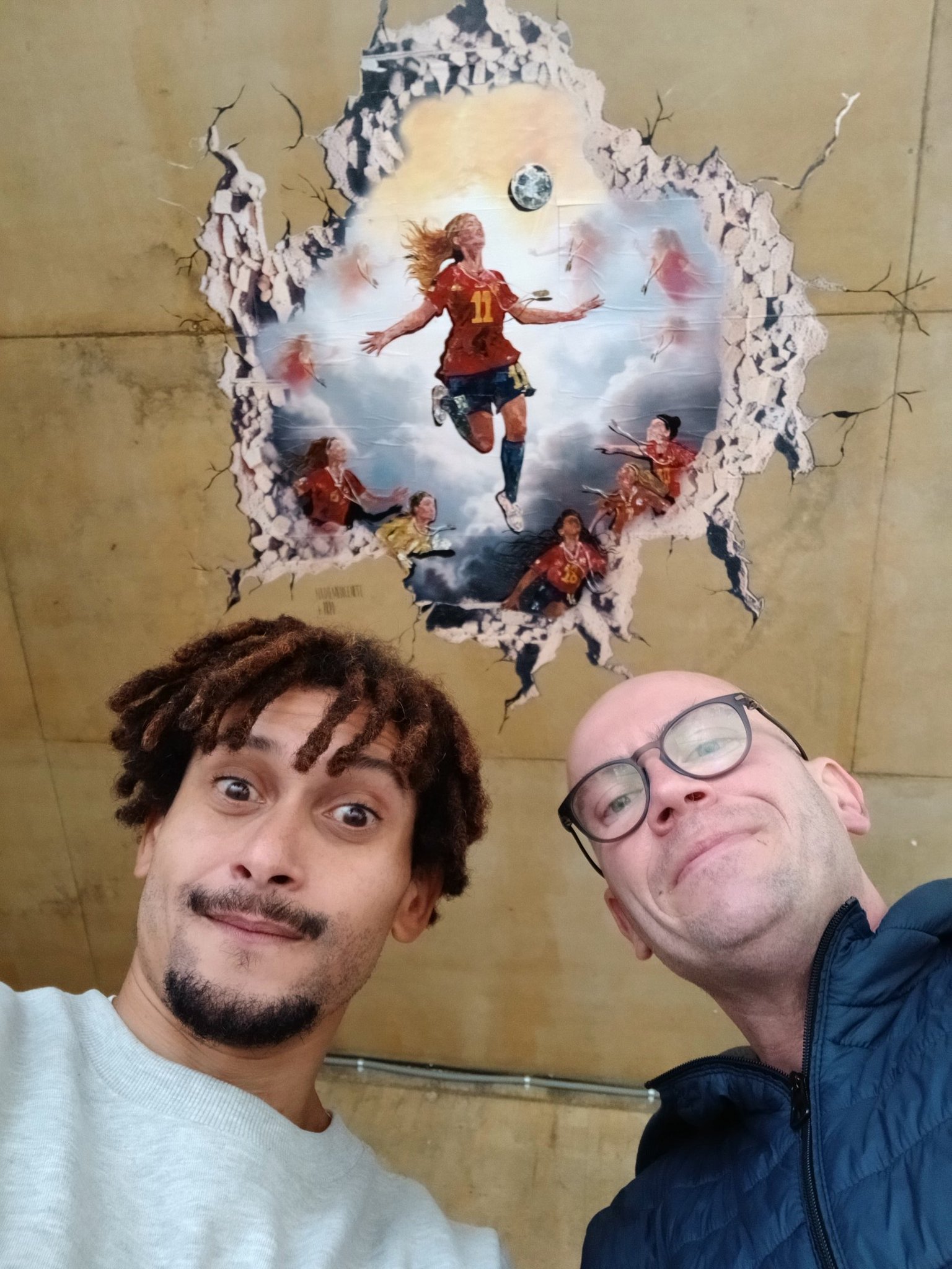 Filip Kubiaczyk z artystą Diego Ojedą, autorem (wraz z Prëo) dzieła „”La capilla de las campeonas” znajdującego się w Barcelonie (źródło: archiwum Filipa Kubiaczyka)