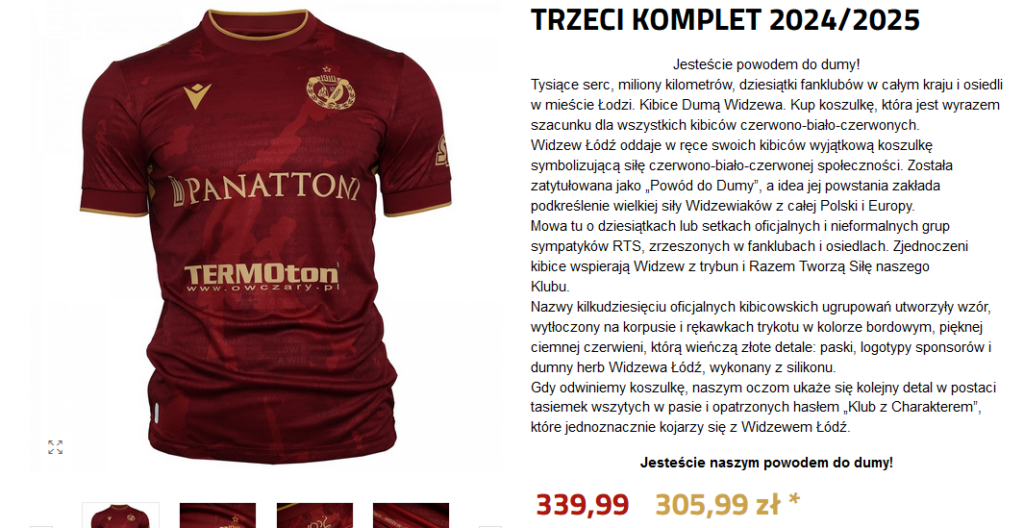 Koszulka jest dostępna w sklepie online klubu z Łodzi, kosztuje normalnie 339,99 zł, dla karnetowiczów jest rabat – cena to 305,99 zł : https://sklep.widzew.com/koszulki-meczowe-20242025/1316-3401-trzeci-komplet-20242025-2010000067994.html.