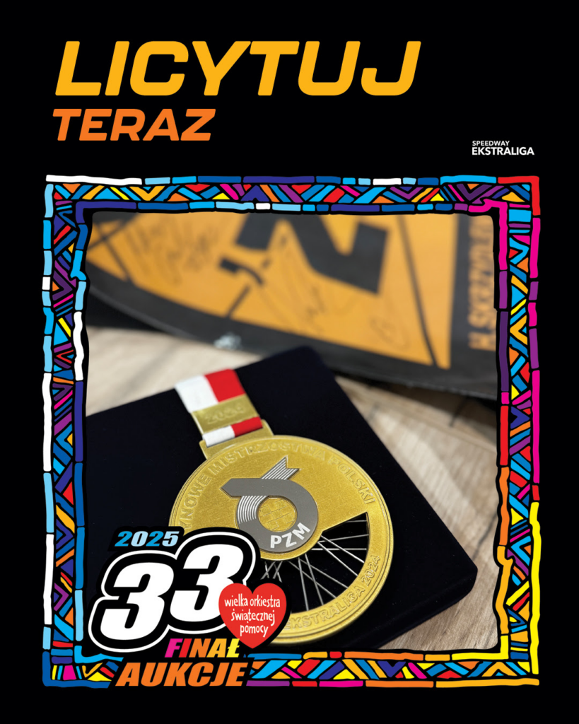 W ramach 33. finału Wielkiej Orkiestry Świątecznej Pomocy, Ekstraliga Żużlowa przekazała wyjątkowe pamiątki. Fani żużla mają okazję wylicytować pakiet: oryginalny złoty medal z finału PGE Ekstraligi 2024 oraz plastron IMME 2024 z autografami. Aukcja jest dostępna na stronie bydgoskiego sztabu WOŚP i potrwa do 10 lutego.