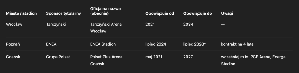 Pozostałe areny Euro 2012 również mają sponsorów tytularnych. Od 2021 roku Tarczyński wspiera stadion we Wrocławiu. Obecna umowa obowiązuje aż do 2034 roku. Stadion w Poznaniu oficjalnie jest „ENEA Stadionem” od lipca 2024 roku. Kontrakt został podpisany na cztery lata. Ostatni z wybudowanych na mistrzostwa Europy obiektów nosił już nazwy PGE Arena czy Energa Stadion. Od maja 2021 sponsorem tytularnym jest Grupa Polsat, stadion nazywa się Polsat Plus Arena Gdańsk. Taka nazwa obowiązywać będzie do 2027 roku.