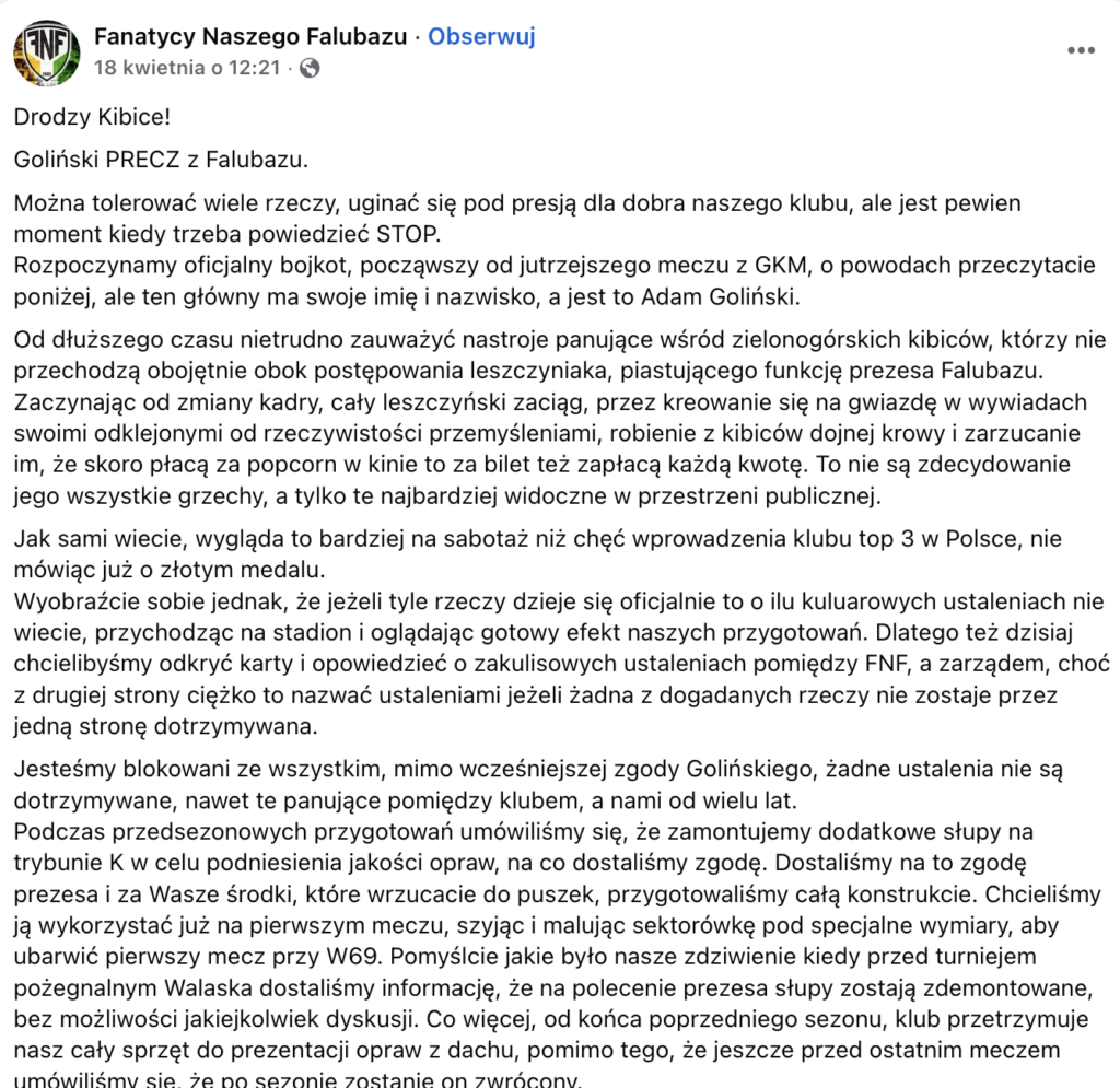 Punktem zapalnym był narastający konflikt między kibicami Falubazu a zarządem klubu, na czele z prezesem Adamem Golińskim. Fani zarzucają władzom m.in. utrudnianie działalności kibicowskiej, brak dialogu oraz decyzje, które ich zdaniem uderzają w wieloletnie tradycje i zaangażowanie trybun. Do tego dochodzą kwestie organizacyjne i finansowe, które tylko pogłębiły frustrację.