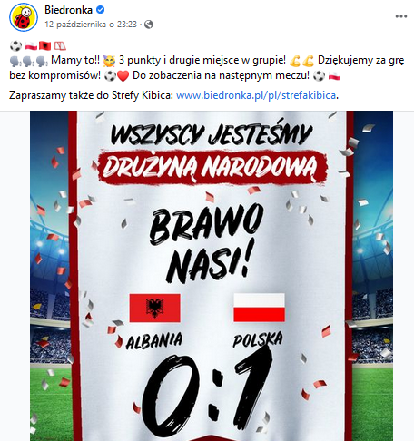 W przypadku Biedronki, umowa z siecią sklepów Jeronimo Martins obowiązuje do końca 2022 roku. Zgodnie z jej postanowieniami, Biedronka nie tylko jest oficjalnym sponsorem pierwszej reprezentacji, ale również wspiera drużynę kobiecą oraz reprezentacje młodzieżowe od 15 do 21 lat. Sieć popularnych sklepów jest ponadto sponsorem Akademii Młodych Orłów oraz Letniej Akademii Młodych Orłów – inicjatyw, których celem jest szkolenie adeptów piłki nożnej oraz trenerów.
