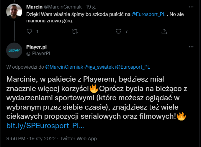 Komunikacja ze strony Eurosportu stoi w tym przypadku na bardzo słabym poziomie i świadczy o tym także powyższa odpowiedź oficjalnego konta Playera do jednego z oburzonych użytkowników. Niestety obecnie wygląda to trochę, jak działania domokrążców, którzy sprzedają garnki lub odkurzacze w atrakcyjnych cenach za kilka tysięcy złotych. Na dłuższą metą w takich sposób polscy fani tenisa raczej zniechęcą się do Playera, niż postanowią go wykupić choćby na czas trwania turniejów wielkoszlemowych.