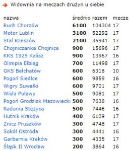 W ten sposób trudno się dziwić frekwencji Odry Opole, Stomilu Olsztyn, Zagłębia Sosnowiec czy GKS-u Jastrzębie. Rozpiętość od 1000 do 1600 kibiców. Tutaj przede wszystkim jakość obiektów robi swoje. Z drugiej strony taki GKS Tychy ma jeden z najlepszych stadionów w lidze, a kończy sezon ze średnią 2500 kibiców na każde 90 minut. Nieco lepiej wygląda Podbeskidzie, ale to też nie są oszałamiające liczby.