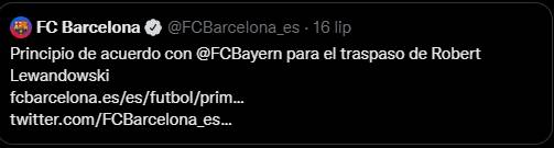 Szesnastego lipca Bayern i Barcelona osiągnęły porozumienie w sprawie transakcji. Około godziny 18:00 na oficjalnym profilu „Dumy Katalonii” pojawił się komunikat dotyczący transferu reprezentanta Polski. Już w tym momencie zespół z Camp Nou zaliczył pewną wpadkę. O ile tego typu posty z reguły nie są specjalne opakowane w kontekście graficznym, to fakt, iż Barcelona zdecydowała się na zacytowanie wcześniejszego wpisu sprawił, iż wizualnie komunikat wypadł kiepsko.