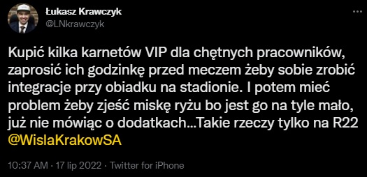 Warto dodać, że według doniesień Szymona Jadczaka, firma miała być związana z rodziną trenera Jerzego Brzęczka. Tę informacje jednak zdecydowanie odrzuciła firma cateringowa w swoim oświadczeniu(treść w kolejnych akapitach), a także rzecznik Wisły Kraków Karolina Biedrzycka. – Nowa firma cateringowa nie jest w żaden sposób powiązana ani z synami trenera Jerzego Brzęczka, ani z Jakubem oraz z Dawidem Błaszczykowskimi – czytamy na Twitterze.