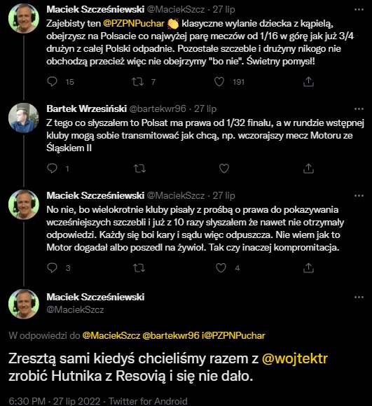 – Według naszej wiedzy kluby gospodarze meczów rundy wstępnej Fortuna Pucharu Polski miały możliwość dowolnego zarządzania prawami do transmisji. Czy klub Stal Rzeszów dostał taką informację od organizatora (PZPN) oraz telewizji posiadającej prawa (Polsat)? – pytaliśmy w mailu. Rzecznik prasowy Stali Rzeszów, Miłosz Bieniaszewski, odpowiedział, że klub nie dostał takiej informacji ze strony PZPN. Jednocześnie przyznał, że rzeszowski klub nie wystąpił z zapytaniem do organizatora rozgrywek ani posiadacza praw do transmisji, czytaj: Polsatu.