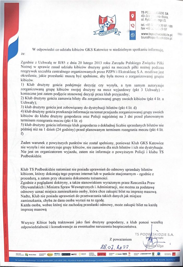 – Informujemy, że zakup biletów na mecz z Ruchem Chorzów, jest prowadzony przez internet tylko dla kibiców TSP. Bilety w punktach stacjonarnych możliwe są tylko dla klientów indywidualnych. (Sprzedaż indywidualna 1 bilet = 1 osoba). Przepraszamy kibiców Ruchu Chorzów, ale ze względu na zakaz nałożony przez PZPN nie możemy Was ugościć na naszym stadionie – czytamy w komunikacie Podbeskidzia.