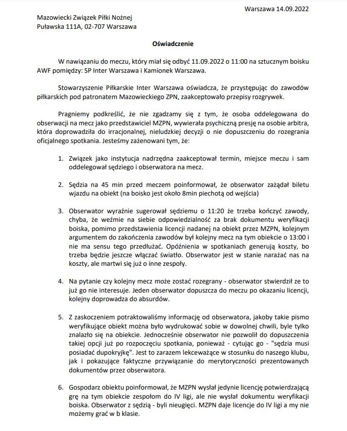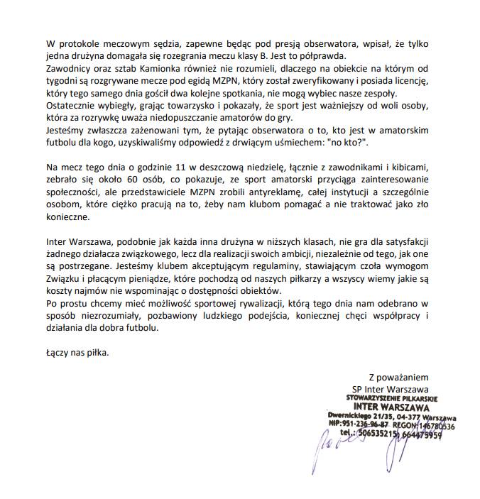 Poszkodowany klub w tej sytuacji już wysłał pismo do związku, w którym na dwóch stronach prezentuje swój punkt widzenia wspomnianej sytuacji. Warto dodać, że klub musi zapłacić kolejne 200 złotych za możliwość odwołania. To oznacza, że cały koszt organizacji meczu, który się nie odbył, wyniósł Inter już 1000 złotych. Na poziomie amatorskim to spore pieniądze. Zwłaszcza, że pochodzą od zawodników, jak wspominał klub w oświadczeniu oraz Michał Zachodny na Twitterze.