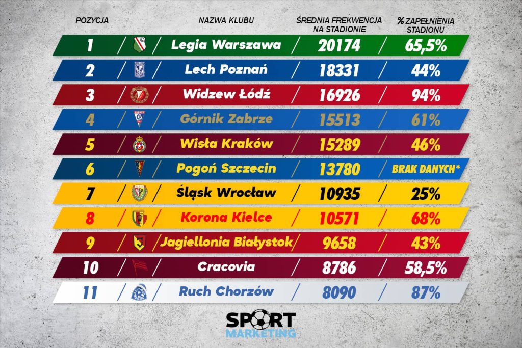 W dużej mierze trudno mówić o jakichkolwiek niespodziankach w tym rankingu. Najwyższy procent zapełnienia stadionu po stronie Widzewa Łódź, czyli coś, co funkcjonowało bez względu na klasę rozgrywkową łodzian od kilku lat. Jednak najwyższa frekwencja przy Łazienkowskiej w Warszawie, a więc powrót legionistów na czoło tabeli pod tym względem i przekroczenie magicznej bariery 20 tysięcy kibiców na każde spotkanie. Jednym z aspektów, który pozwolił na taki wynik, były akcje promocyjne stołecznego. Im wyższa frekwencja na najbliższym meczu, tym odpowiednio tańsze bilety na kolejny. W ten sposób kibice bez karnetów sami mogli wywalczyć dla siebie i pozostałych atrakcyjne zniżki.