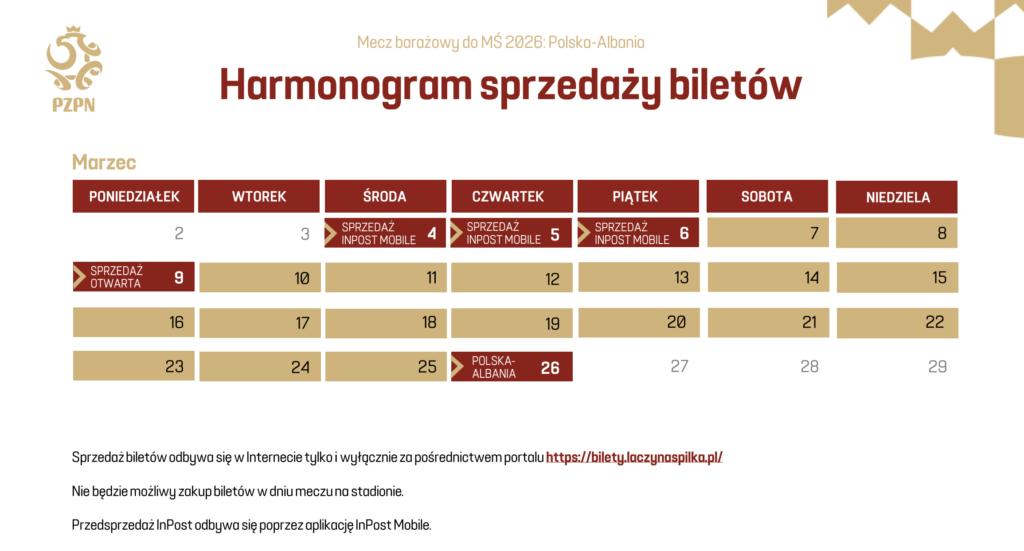 Organizatorzy opublikowali już harmonogram sprzedaży biletów, a także szczegółowy podział wejściówek na kategorie cenowe. Oferta została przygotowana tak, aby umożliwić udział w meczu jak najszerszej grupie kibiców – od fanów chcących zasiąść w najlepszych sektorach, po rodziny z dziećmi oraz osoby z niepełnosprawnościami.