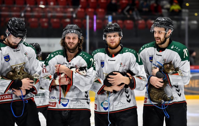 Hokeiści GKS-u Tychy wyjechali na lód w asyście zwierzaków ze schroniska