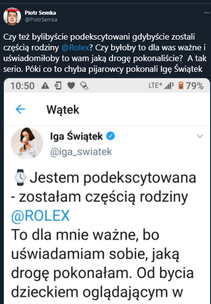 – Jestem podekscytowana, że zostałam częścią rodziny Rolexa – ten fragment wywołał chyba największe oburzenie wśród krytykujących. Mało kto pomyślał jednak, że mogło chodzić o rodzinę ambasadorów. Takie sformułowanie bardzo często padają w światowym sporcie w wielu dyscyplinach. Owszem, w Polsce jest inna kultura, ale generalnie Rolex podpisując umowę z Igą raczej nie celował typowo w nasz rynek. Świątek bowiem jest rozpoznawalna na całym świecie wśród fanów tenisa. I to kibice tenisa, którzy zwykle są zamożni mają kupować zegarki, a nie Polacy, którzy dowiedzieli się o tej marce, po publikacji postu 19-latki.