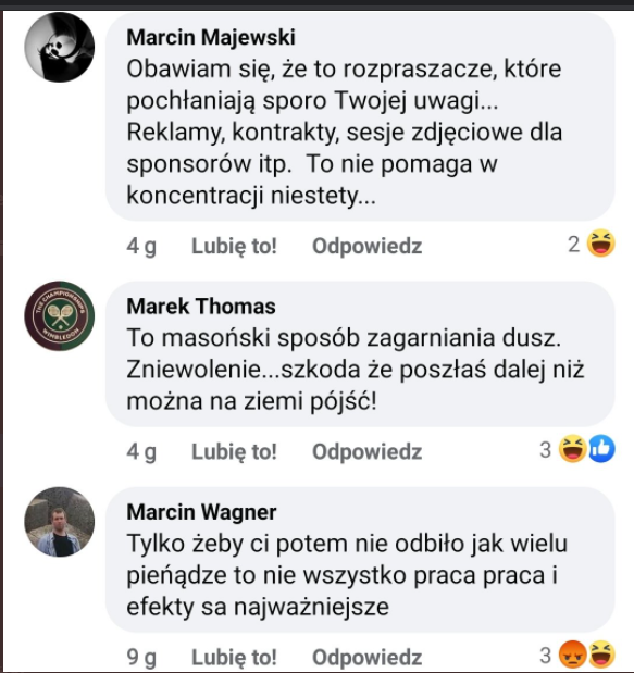 Na początku pomyślałem, że być może ludzie są już tak sfrustrowani pandemią, że szukają ukojenia bólu w Social Mediach… Po chwili przypomniałem sobie jednak, że jak Robert i Anna Lewandowscy przekazali milion euro na walkę z pandemią koronawirusa, to liczba podobnych komentarzy była zbliżona. A to przecież był początek tego wszystkiego. Czyli frustracja z powodu przeciągającej się pandemii odpada, zostaje zwykła i ohydna zazdrość.