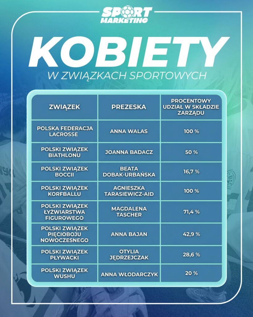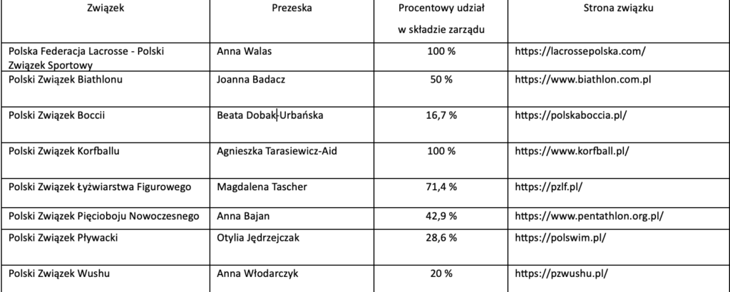 Kobiety zajmują tylko 11,42 proc. stanowisk prezesek w polskich związkach sportowych. Obecnie kierują ośmioma organizacjami, a cztery z nich zarządzają dyscyplinami olimpijskimi – łyżwiarstwem figurowym, biathlonem, pięciobojem nowoczesnym i pływaniem. Wśród związków kierowanych przez kobiety najwyższy udział pań w zarządach mają Lacrosse i Korfball – 100 proc. Mimo rosnącej obecności kobiet w polskim sporcie, wciąż istnieją federacje, w których brak jest ich reprezentacji w kierownictwie. W niektórych największych polskich związkach sportowych kobiety wciąż nie zajmują stanowisk w zarządach. Przykładem są Polski Związek Muaythai, Polski Związek Narciarski czy Polski Związek Piłki Nożnej (PZPN), gdzie w składach zarządów nie ma ani jednej kobiety.