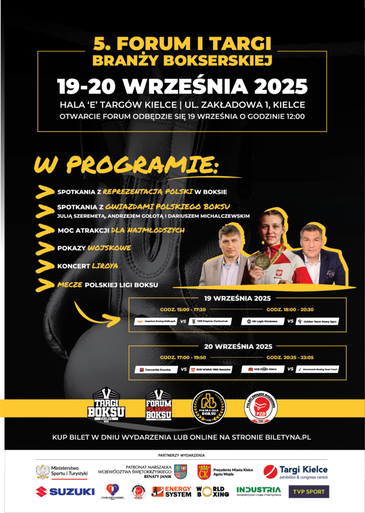 W dniach 19–20 września 2025 roku Kielce staną się centrum polskiego i europejskiego boksu. Odbędzie się tam 5. Forum Polskiego Boksu i Międzynarodowe Targi Branży Bokserskiej – wydarzenie, które integruje całe środowisko pięściarskie i stanowi unikalną platformę wymiany doświadczeń sportowych, edukacyjnych i biznesowych.