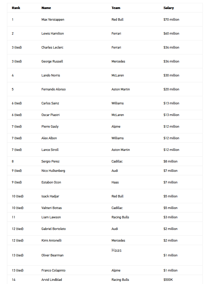 Prezentujemy listę ujawnionych zarobków zawodników Formuły 1 w sezonie 2026.