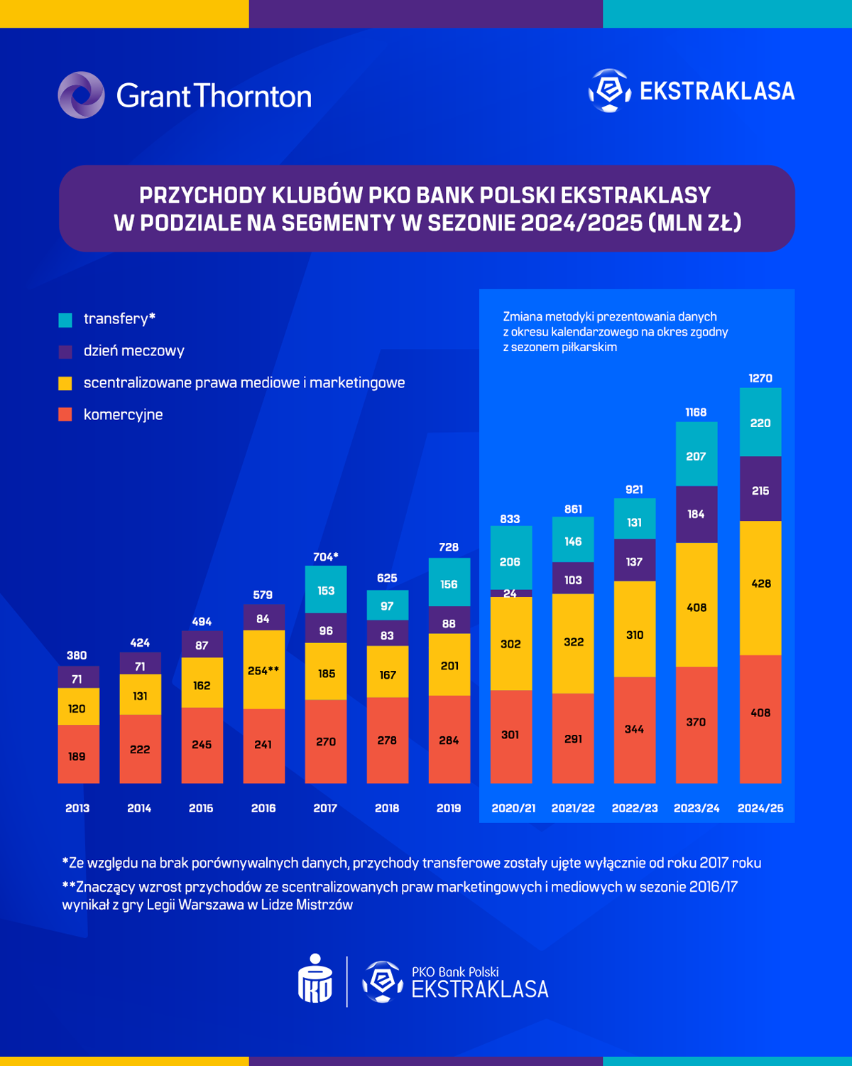 – Polska piłka klubowa – od strony sportowej, ale też biznesowej – wyraźnie złapała w ostatnich latach wiatr w żagle i konsekwentnie idzie naprzód. Sezon 2024/2025 był dla klubów PKO Bank Polski Ekstraklasy kolejnym okresem rozwoju skali biznesu. Co więcej, jest to rozwój zrównoważony, a więc poprawa nie wynika z jednego, przypadkowego czynnika, ale wszystkie „silniki” wzrostu pracują równomiernie – komentuje Tomasz Mleczak, Partner w zespole Corporate Finance w Grant Thornton.