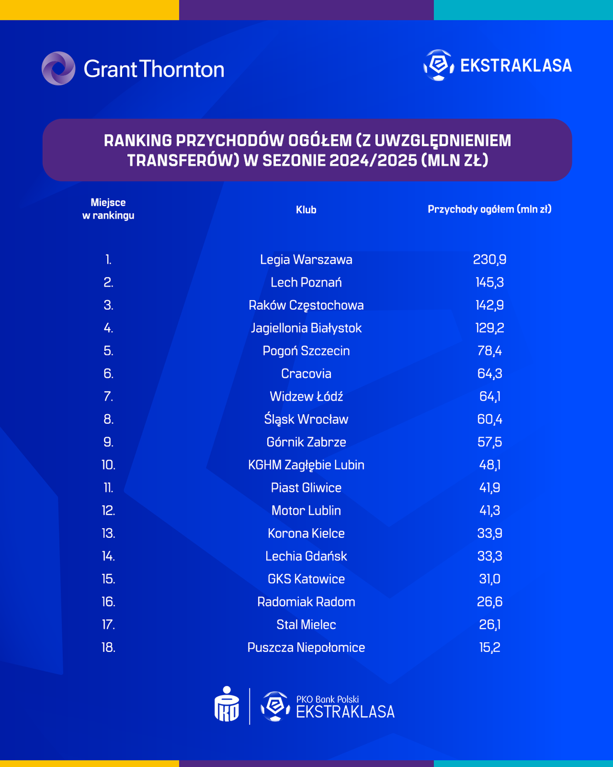 W sezonie 2024/2025 największe przychody wypracowała Legia Warszawa, odnotowując przychody ogółem na poziomie 231 mln zł. To co prawda spadek o 13% w porównaniu z poprzednim sezonem, ale wynik sprzed roku był wyjątkowo wyśrubowany (rekord wszech czasów w historii polskiej piłki), więc mimo korekty Legia nadal jest zdecydowanym liderem ligi. Stołeczny klub wygenerował wysokie przychody we wszystkich segmentach, w tym bardzo wysokie wpływy od UEFA, dzięki swoim sukcesom w europejskich pucharach.