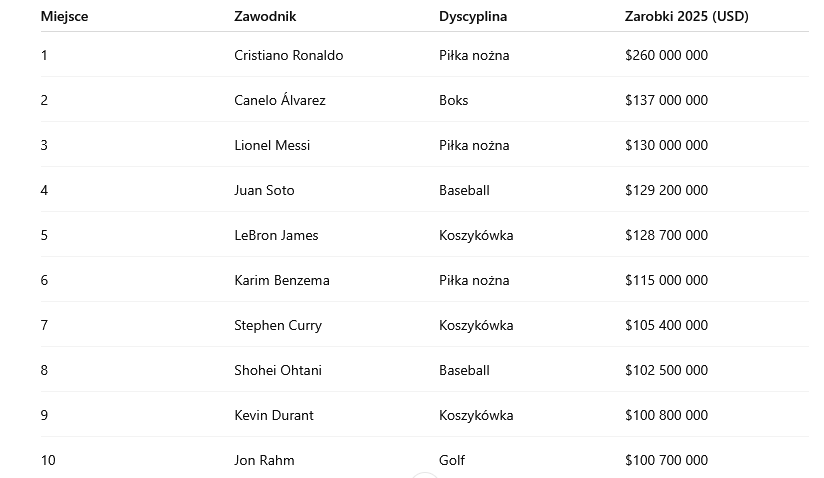 Lista top 10 według Sportico obejmuje też m.in. boksera Canelo Álvareza, piłkarzy Lionela Messiego i Karima Benzemę, a także gwiazdy MLB i NBA – takich jak Juan Soto czy LeBron James. To pokazuje, że wysokie płace i dochody nie są domeną jednej dyscypliny, ale rozszerzają się na wiele segmentów sportu. Całościowe zarobki stu najlepiej opłacanych sportowców sięgają ponad 6 miliardów dolarów, co obrazuje dynamiczny wzrost ekonomii sportowej globalnie.