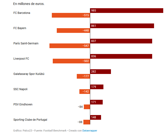 Barca wygenerowała blisko 985 milionów euro przychodów, co oznacza wzrost o 29% w porównaniu z poprzednim sezonem i stawia ją na czele europejskiego rankingu klubów mistrzowskich.
