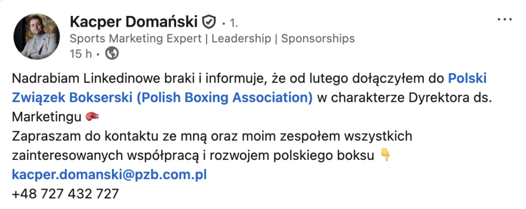 Domański na Linkedin zaprasza wszystkie firmy, instytucje oraz osoby zainteresowane współpracą i wspieraniem rozwoju polskiego boksu do kontaktu bezpośredniego z nim oraz zespołem marketingowym związku.