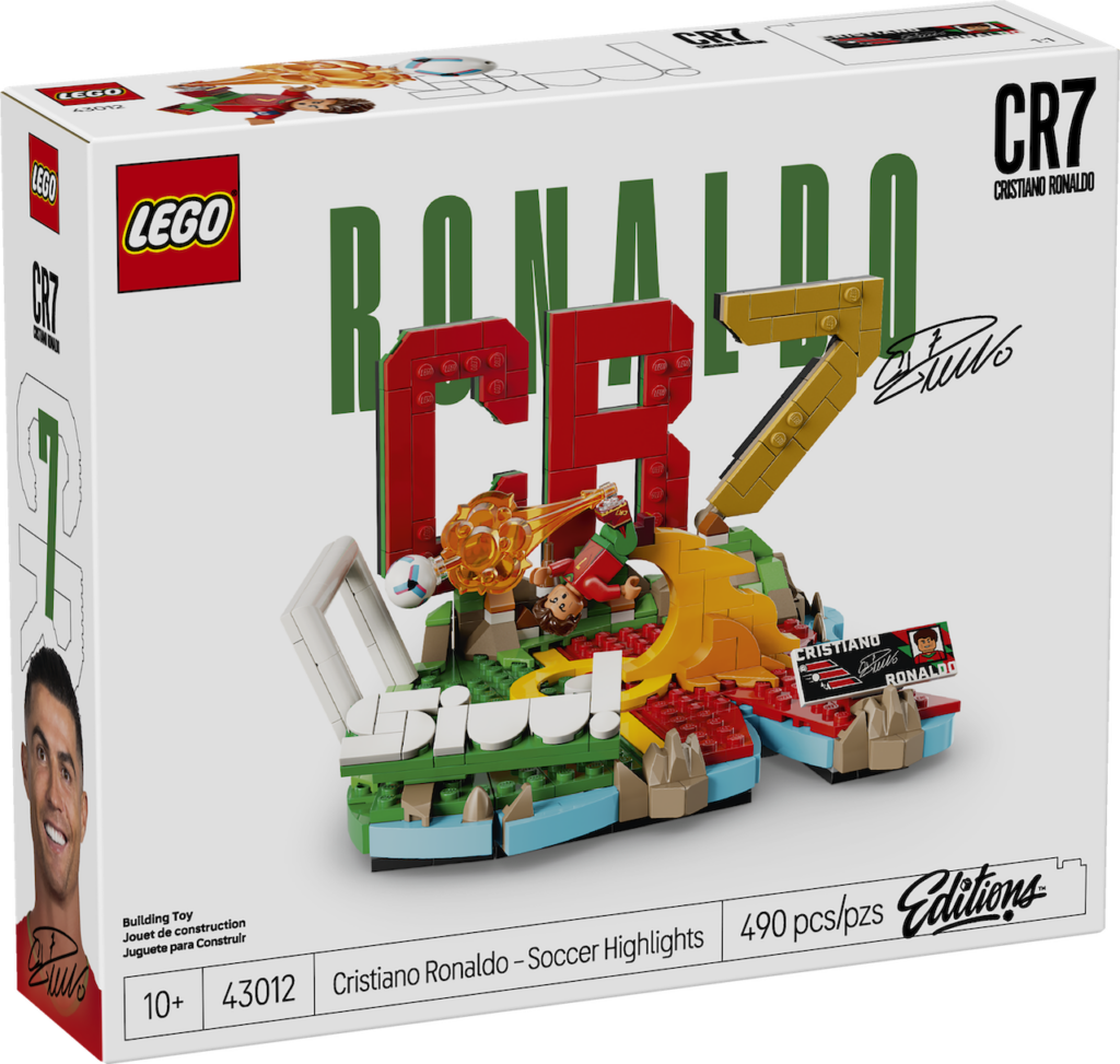 - Dla fanów, którzy chcą uczcić CR7, zestaw LEGO® Editions Cristiano Ronaldo – piłkarskie momenty (43012) zawiera podstawę z klocków w kształcie litery R, nawiązującą do barw Portugalii i kultowego znaku CR7 Ronaldo. W tym 490-elementowym modelu fani znajdą szczegółowe nawiązania do kariery Ronaldo oraz minifigurkę LEGO przedstawiającą piłkarza, a także kolekcjonerską tabliczkę.