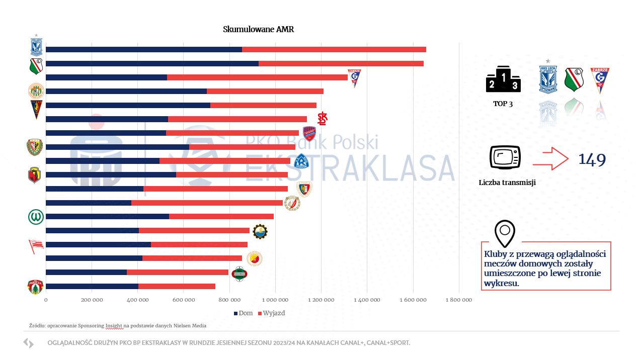 „W kontekście sponsoringu sportowego kluczowe jest również zestawienie skumulowanego AMR z podziałem na mecze domowe oraz wyjazdowe” – czytamy w poście opublikowanym przez Sponsoring Insight. „Oglądalności telewizyjne są istotną składową do określenia ekwiwalentu reklamowego generowanego przez marki widoczne na ekranie odbiorników, natomiast większość świadczeń umownych na rzecz sponsorów realizowana jest podczas meczów na własnym obiekcie. Szczegółowa analiza danych pomaga dostarczać klubom i sponsorom wielu cennych informacji, a w efekcie dostosować odpowiednią strategię do działań sponsoringowych” – dodają autorzy zestawienia.